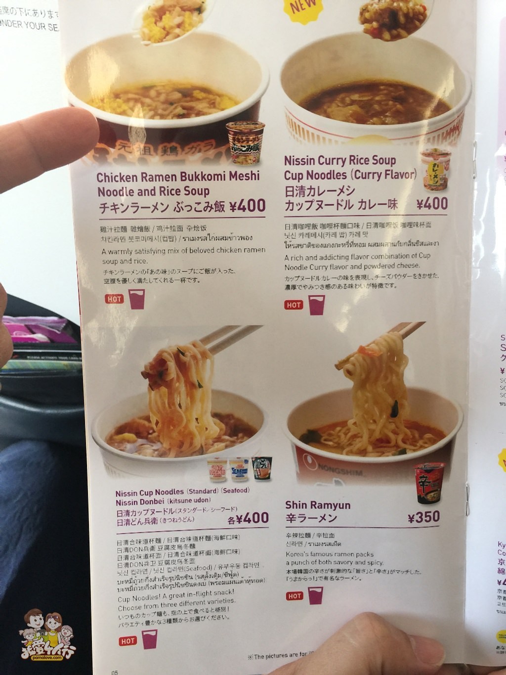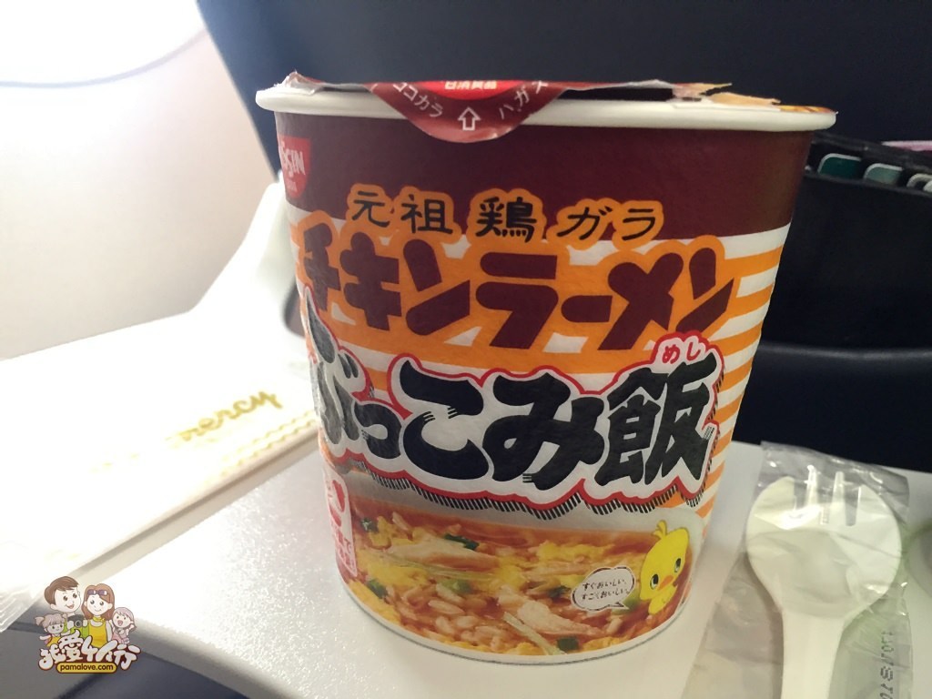 機上的泡麵總共有四種,有雞+拉麵(雞燴飯)、日清咖哩飯、日清合味道杯麵、辛辣拉麵等,我們後來選了雞燴飯跟日清合味道杯麵。