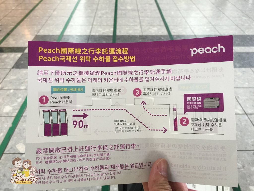 從上圖可以看到,Peach 櫃台(check in 機器)的位置與國際線行李托運櫃台距離約 90 公尺。