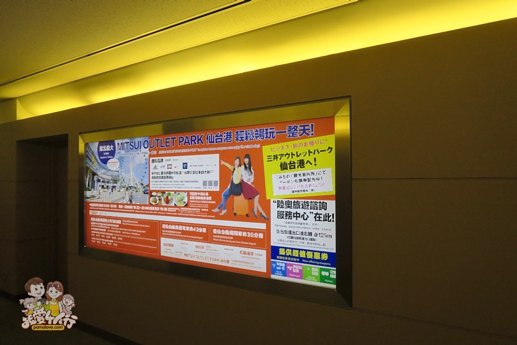 仙台機場的通道上可以看到仙台港附近的旅遊訊息。