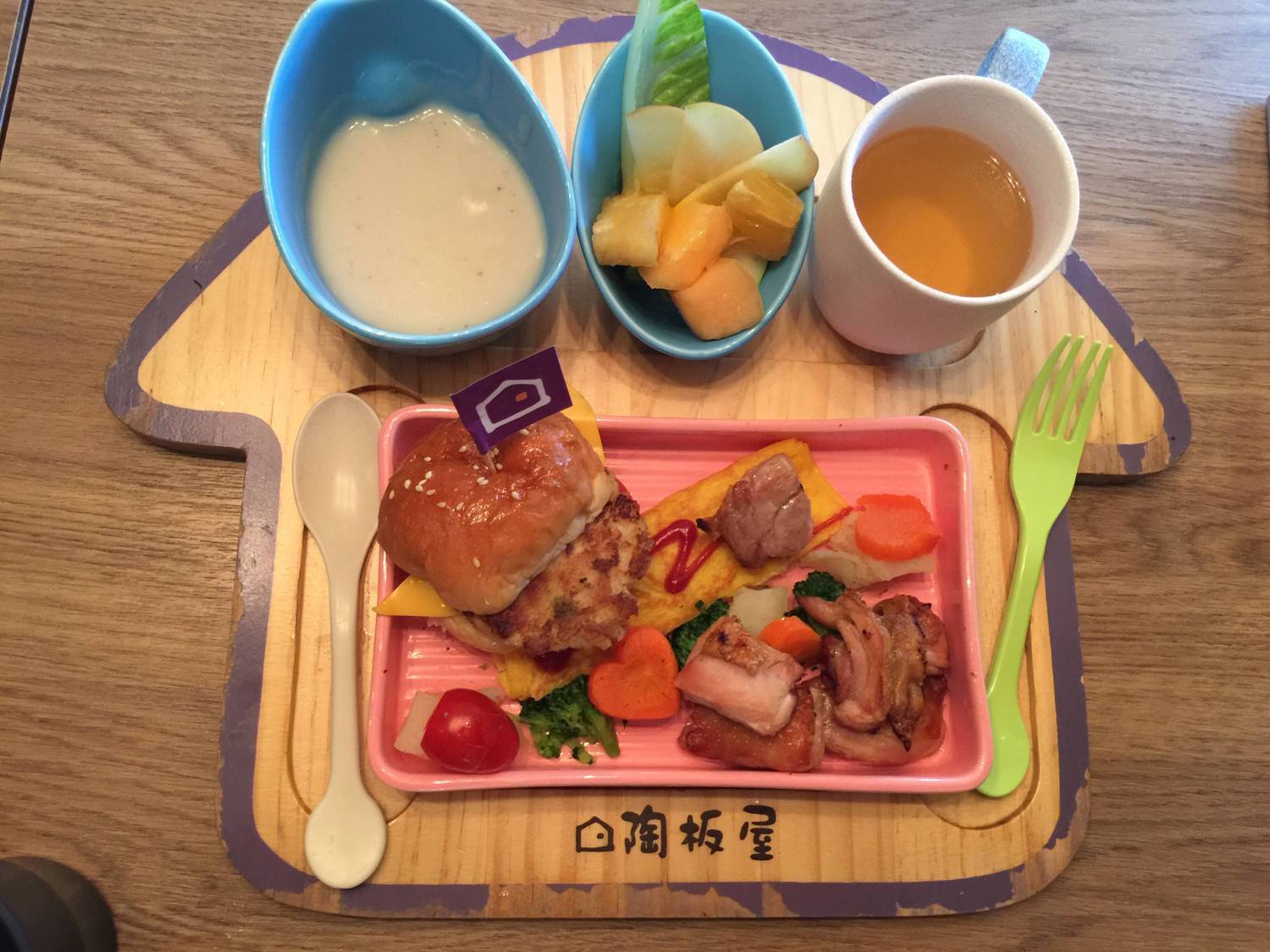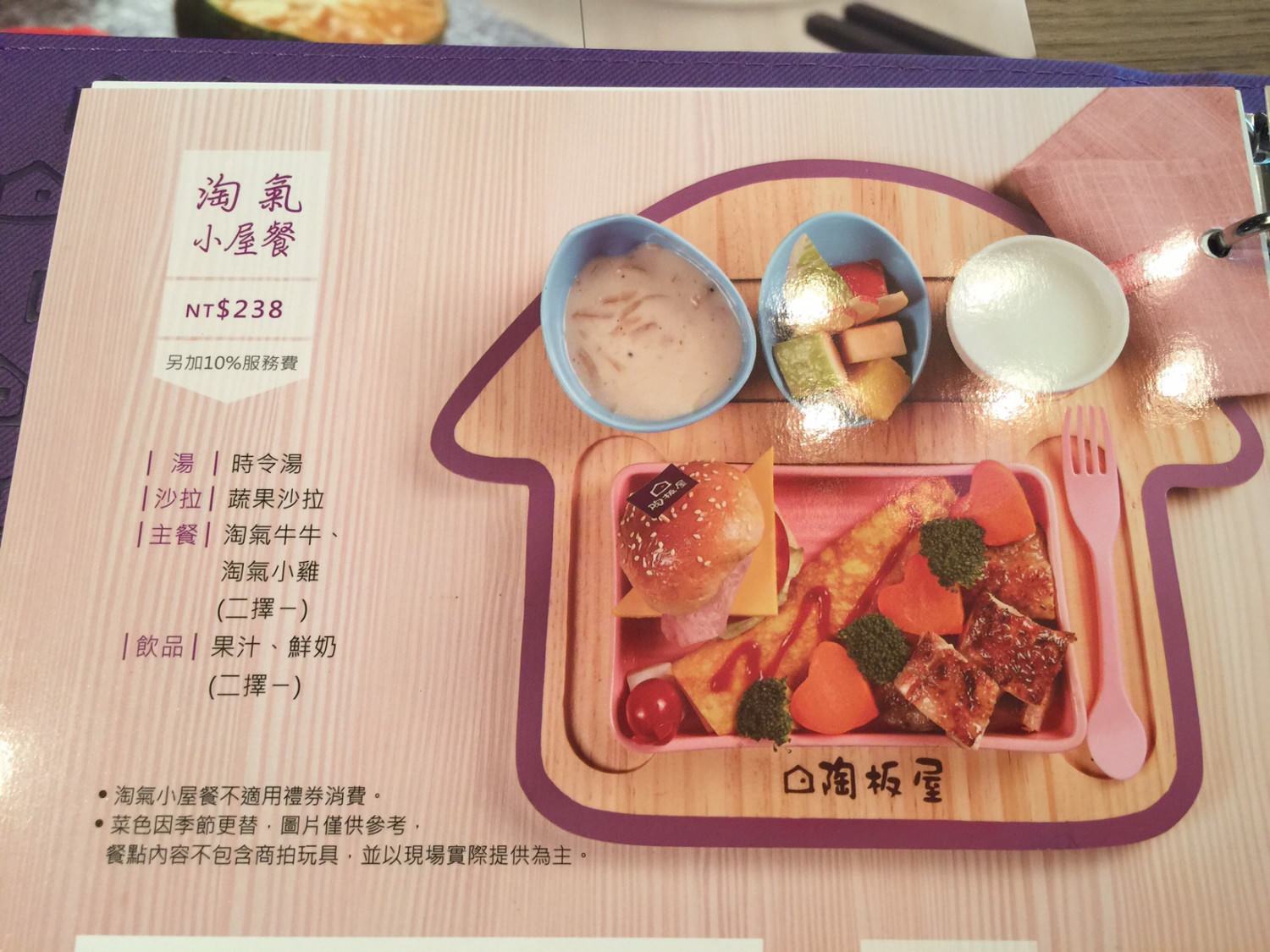 但是陶板屋的淘氣小屋餐(兒童餐)就設計的很棒。可愛的小屋式的擺盤,上面的菜色是足量的肉食、蔬菜、湯品跟水果,不單單小朋友可以吃的很開心,重點是整體的營餐非常的均衡。