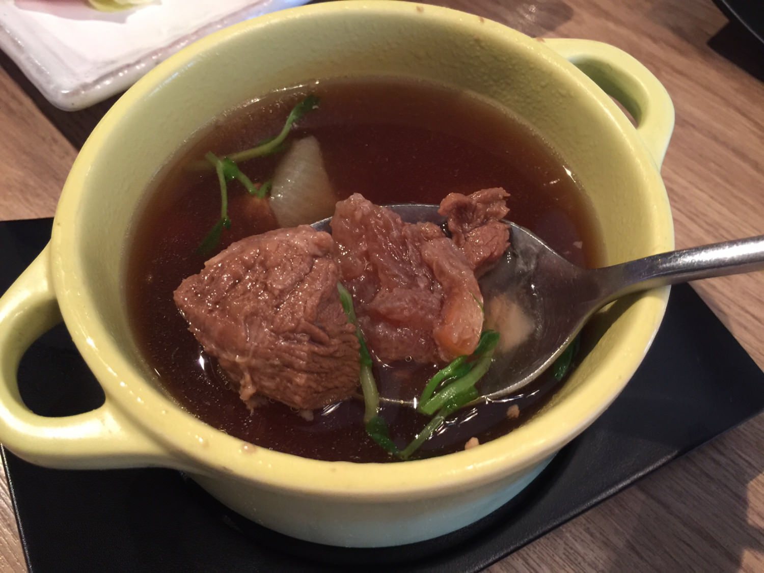 首先是我只要來陶板屋必點的百合牛肉湯。這道我有記憶以來,從我去陶板屋好像就有這道湯品了,這算是萬年不變的扛棒湯品。湯的部分味道濃郁不油膩,牛肉的部分我覺得有變大塊,但是因為是冷凍牛肉(可能是紐澳美),會些微的牛腥味,對我這個平常都有吃牛的人士還好,如果不吃牛的人建議點其它的。