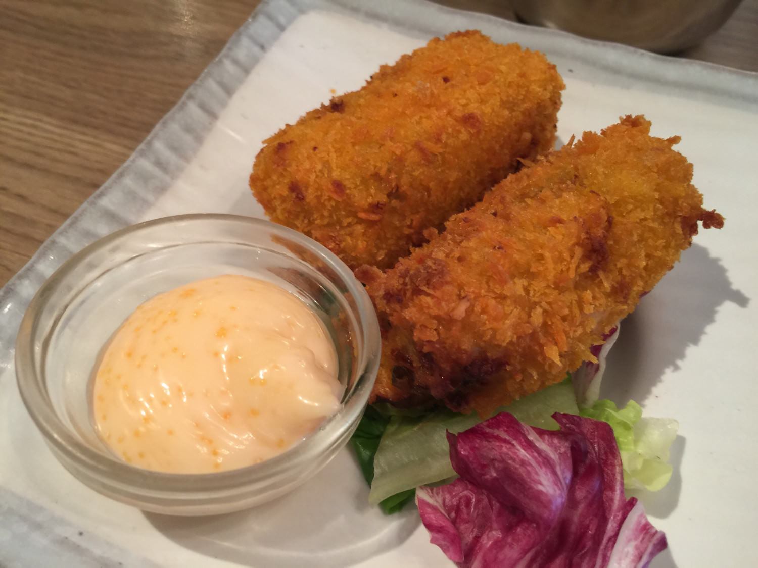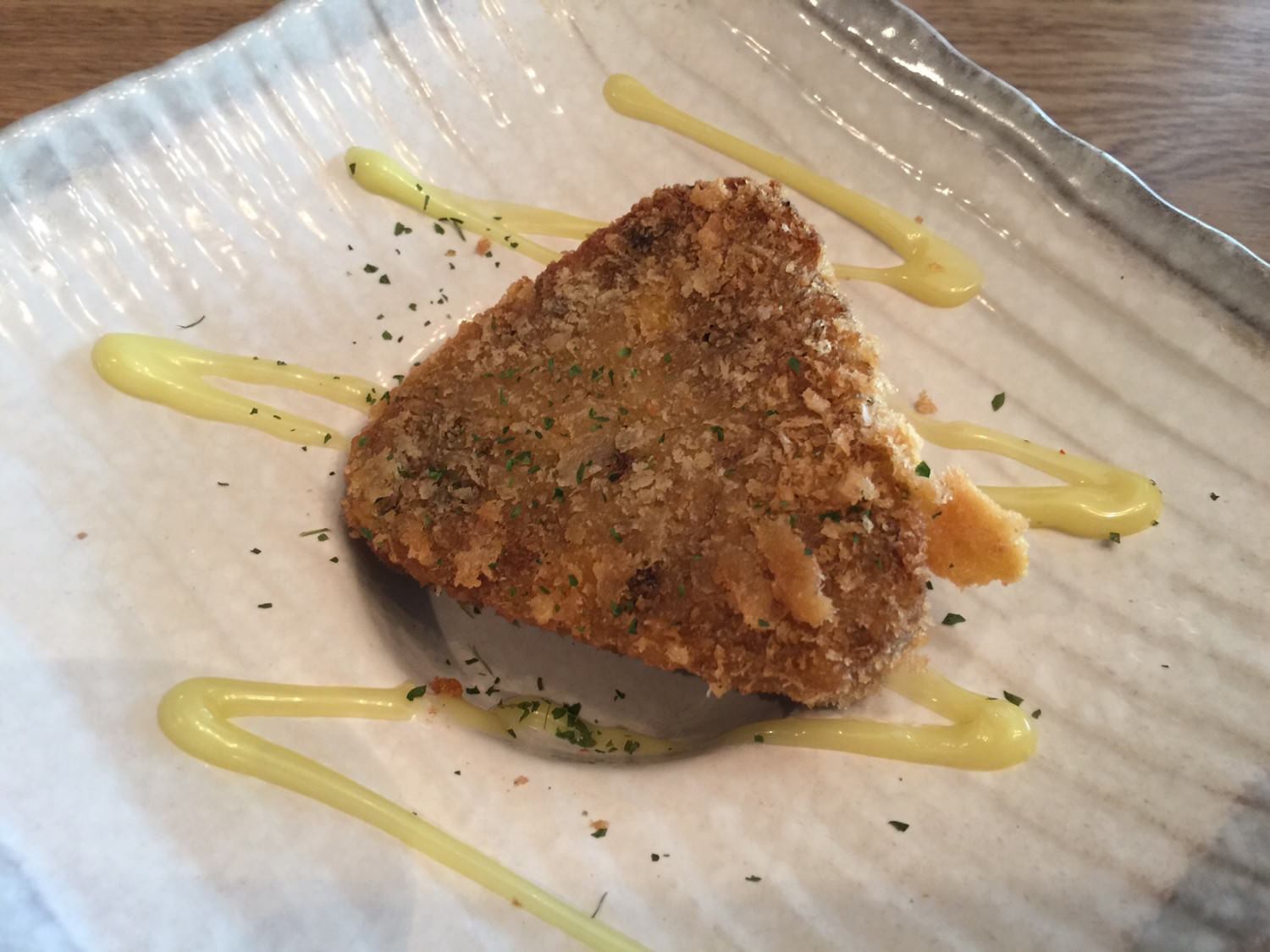 對了,不知道是不是因為我們點了四客套餐,所以還給我們主廚招待的炸可樂餅….超飽啦!!!! ^_^