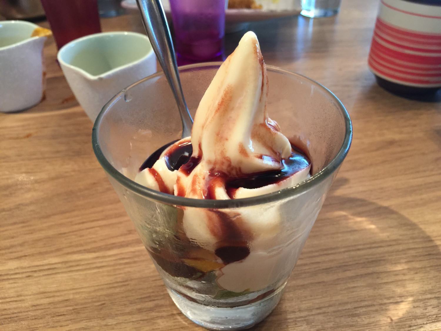 我點的香蕉巧克力聖代…因為我不能吃,結果被小朋友愉快的秒殺完畢。聖代的下面是蛋糕,但是整體味道極甜…對於有點年紀的朋友建議避免 XD