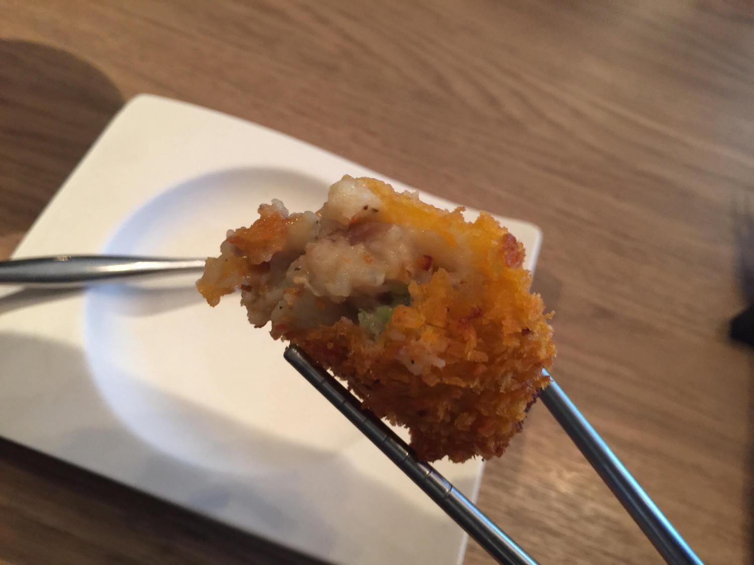 這道是照燒雞肉炸飯糰。飯團本身的每顆飯粒都吸飽了湯汁,裹上雞肉之後在進行油炸而成,非常好吃,但是因為前面已經吃很多了…我們基本上是硬擠吃完的。