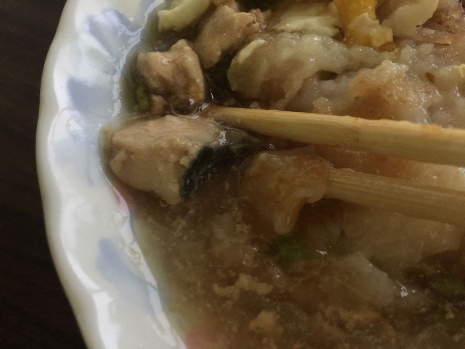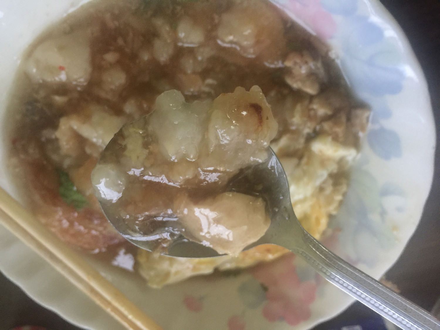 蕃薯厝肉粿仔裡面的湯頭非常非常好喝,是那種傳統在辦桌店裡面吃到的類似魚翅羹的味道,但是沒有勾芡得那麼厲害,而且吃完也不會有味精感(我很敏感),湯汁裡面還有魚肉跟肉燥,寫到這裡我的口水又留下來了….