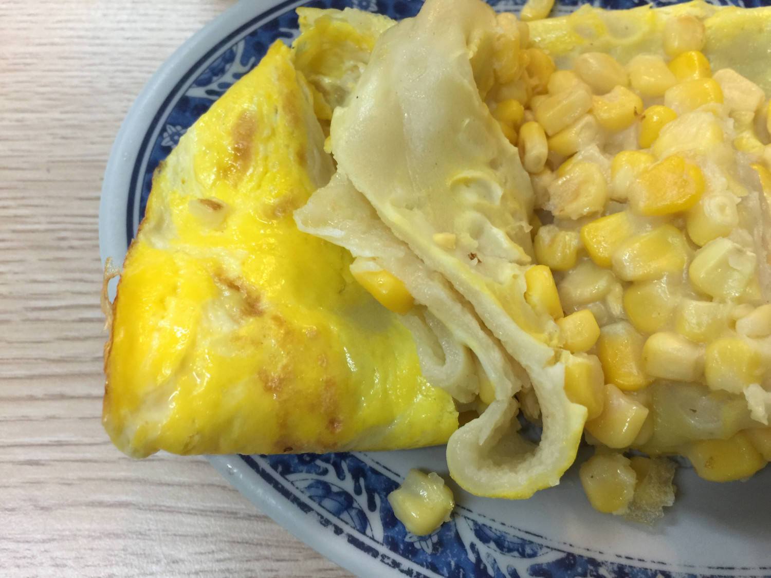 負責烹煮的阿姨我每次看她做蛋餅都覺得療愈,因為她都是很豪邁的倒入粉漿、然後開一整罐的玉米罐頭灑在蛋餅上,接著再盛到另外一個長方形的鐵盒裡。