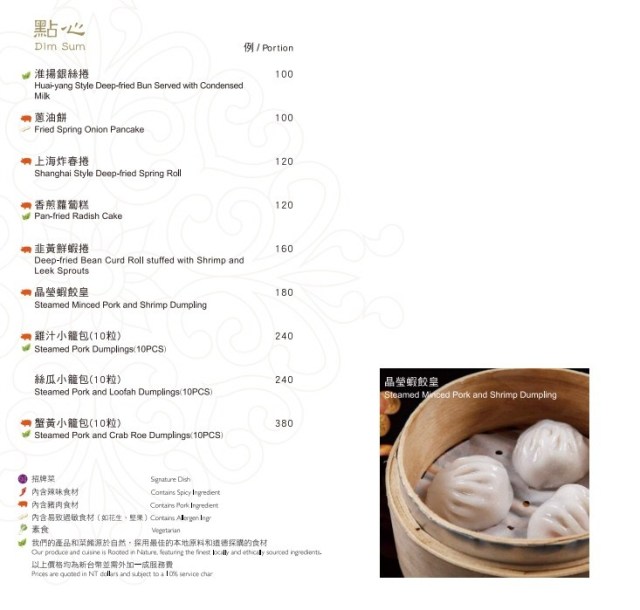 來看一下午間港式點心雙面的菜單~港式點心分為$148/$168/$188三個價位,比起8年前來用餐,的確漲價了呀….如果沒有打折優惠活動,我們應該也不會來吃哈哈哈XD