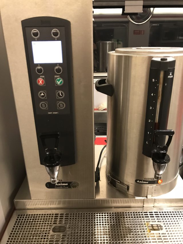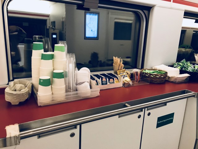 食物方面,列車上供應熱可可熱咖啡及小包裝的三角鋁箔包牛奶,先告知櫃檯人員結帳,再拿著紙杯再到旁邊用熱水自行沖泡即可~