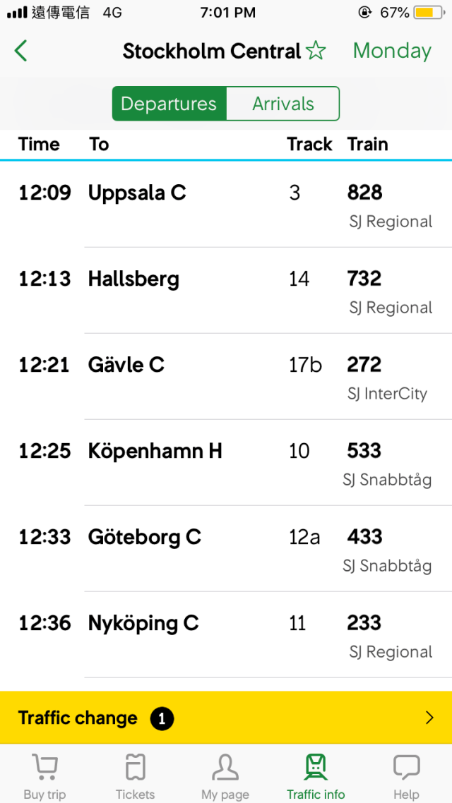 所以建議大家可以下載瑞典火車的“SJ”APP,可以即時查看列車是否有延誤的訊息,如果還不放心的話,也可以詢問車上的工作人員喔!反正出外為了確保行程順利,不確定的事情多問就對了!