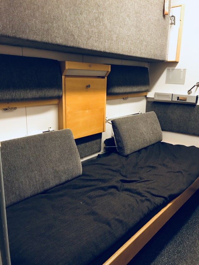 這是高級的二人房艙等,路過看到空房偷拍一下,真的很商務車廂的感覺,裡頭還有獨立浴室,沙發放下即是座椅、上面的沙發放下就是兩張床囉!