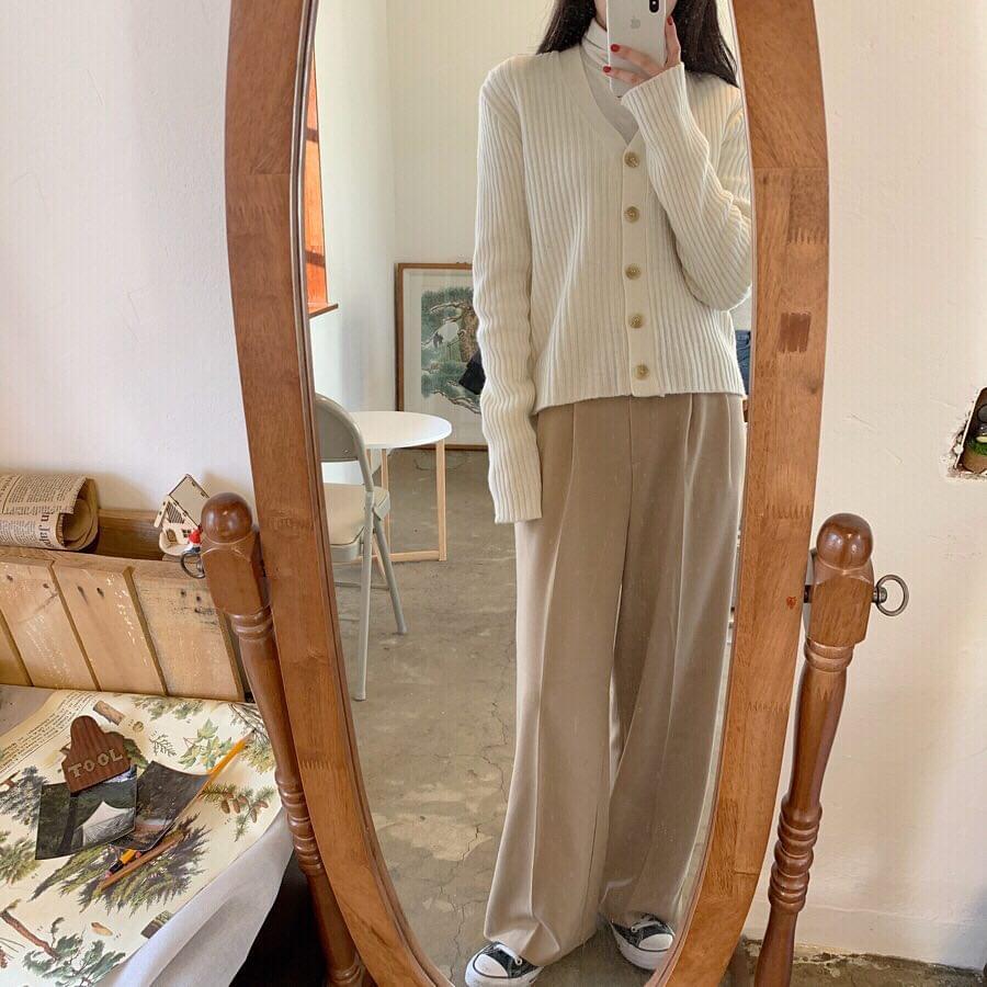 落地褲與針織衫、棉t的組合都可以穿出休閒感,視覺上有種慵懶、自在的感覺