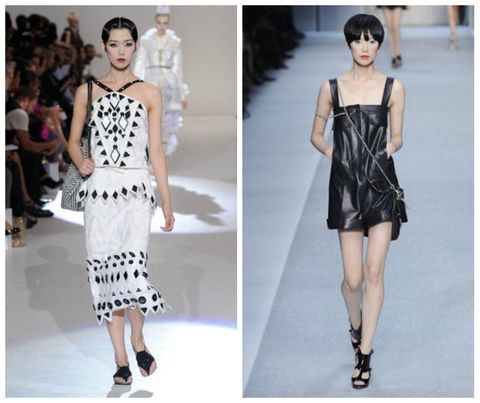 (左)上身的垂墜設計與下身的開岔設計,原本已經高人一等的她,更顯修長,色彩雖顯低調,但亮片製造出的光澤卻引人遐想,性感迷人。(右)鏤空創造出視覺上的輕盈感,透過層次上的若隱若現,神秘氣息隨之飄出。