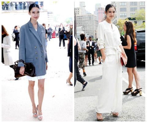 (左)中性版型的寬鬆雙排外套,微微襯出的百折下襬添入一絲甜美,率性拎上大版型手提包,展現不拘小節的大氣女人姿色。(右)全白的簡約搭配,以繫帶勾出自然腰線,手拿同樣是簡單款式的硬挺包,不過多的顏色與裝飾盡顯她的典雅質感。