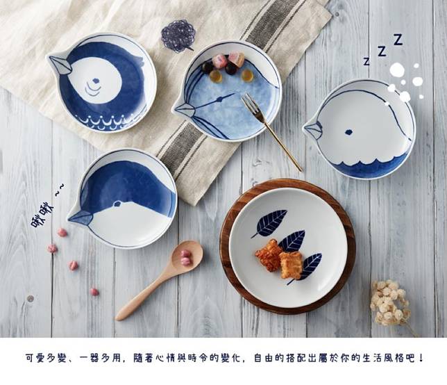 清透優雅的白瓷上用靛藍色的顏料繪製的餐碟,仔細地分別畫出鳳頭鸚鵡、紅頭伯勞、虎皮鸚鵡跟燕子~愛鳥人士絕對會愛上的一組餐碟!小鳥的嘴巴是凸出的造型,很方便拿取。