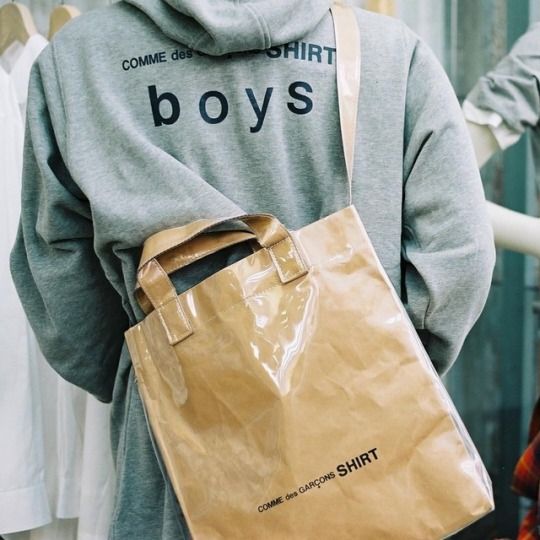 日本設計師川久保玲個人品牌 COMME des GARÇONS 旗下附牌 Shirt,在前幾年推出了以牛皮紙袋結合 PVC 塑料的托特包,簡單又獨特的造型,容易搭配的特性與搶眼的外型,讓該包款一上市就立刻秒殺,即便後來再版過一次,也依舊一包難求!許多街拍及 Inatagram 上的潮人也都狂曬這款包。