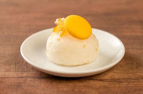 甜點推出「柚子雪貝」,柚子經糖漬後融入雪貝,搭配製菓師傅手工自製、如天上明月的黃色馬卡龍,十分應景,