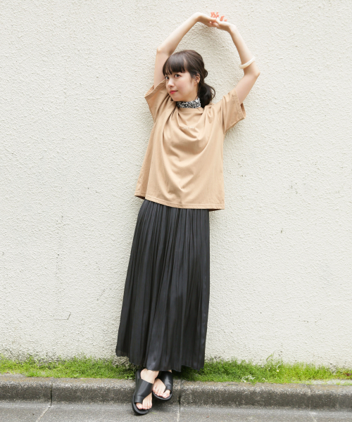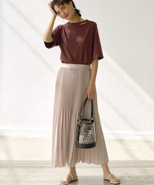 單色 Tee 簡約的有點無趣,但又偏愛素色的衣著時,就利用有著特殊剪裁的上衣來完成穿搭。不管是削肩的特色袖口,或是刻意於領口處的劃破設計,透過小小的設計變化再加上百褶長裙就能擁有簡約卻個性滿分的穿搭。