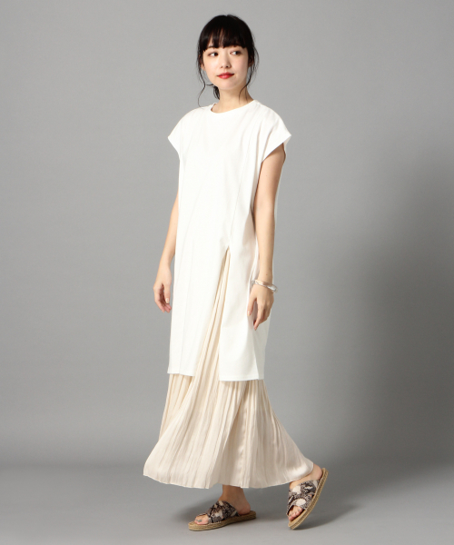 單色的百褶長裙除了單純做為一般下身單品著用,應用於長版衣著時還可以輕鬆堆疊出輕巧的多層次印象。擔心比例不佳的話可以選擇有著開岔設計的長版 Tee,或是能做出腰身感的中長版上衣,利用百褶裙的經典打褶就可以打造出簡易的服裝層次。