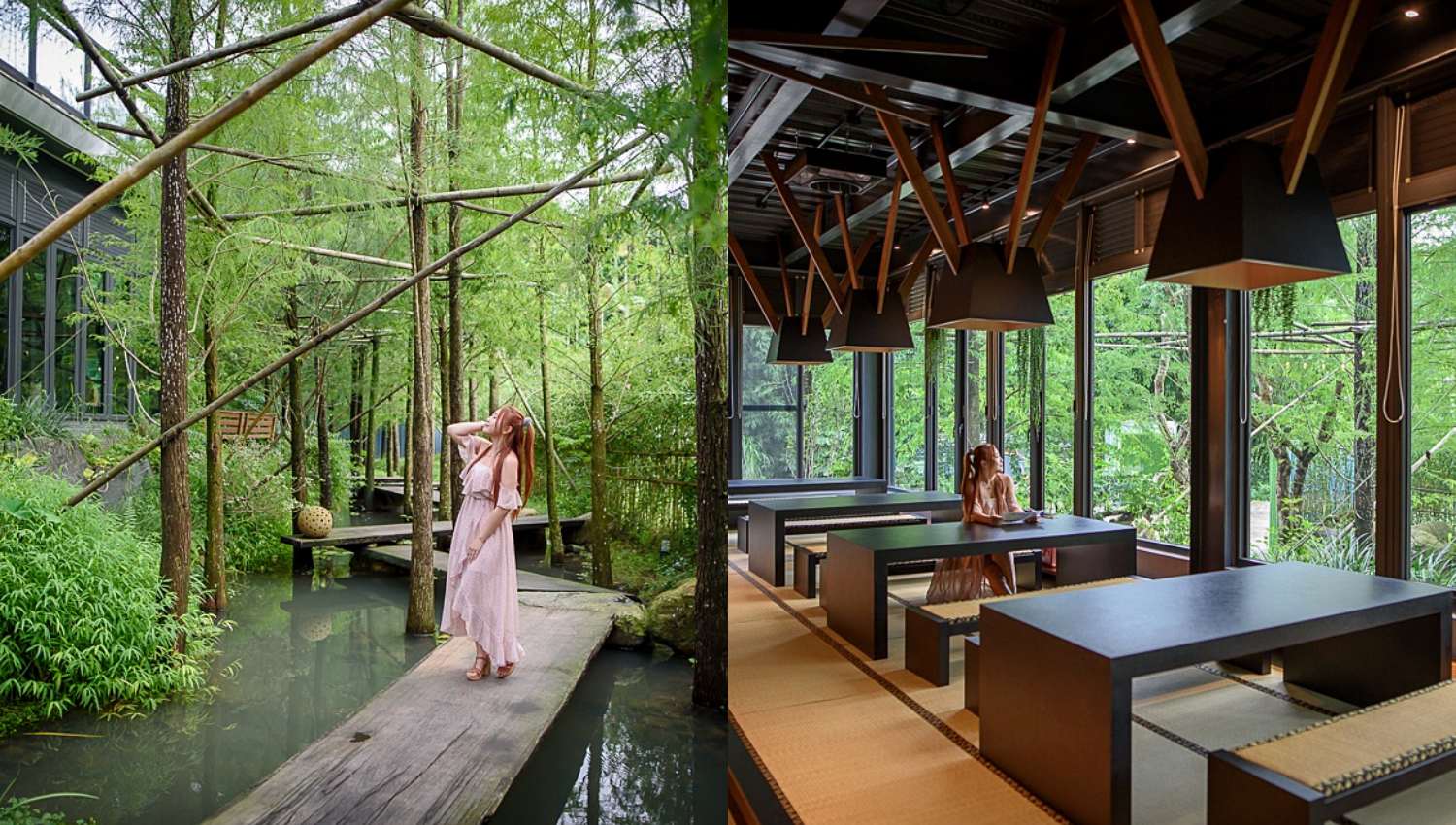 店座位數總共60席,室內大面積落地窗,讓窗外的綠意、木棧道的蜿蜒優美都能一次看到,儂編及推薦靠窗的榻榻米座位區,很像到了日本ㄧ樣。若想來這裡單純拍照,也不用在另外買門票就可以進場。同時也歡迎攜帶毛小孩的旅人一起來散步,但餐廳部分座位區為榻榻米,需另外將毛孩們裝在寵物箱才能帶進場。