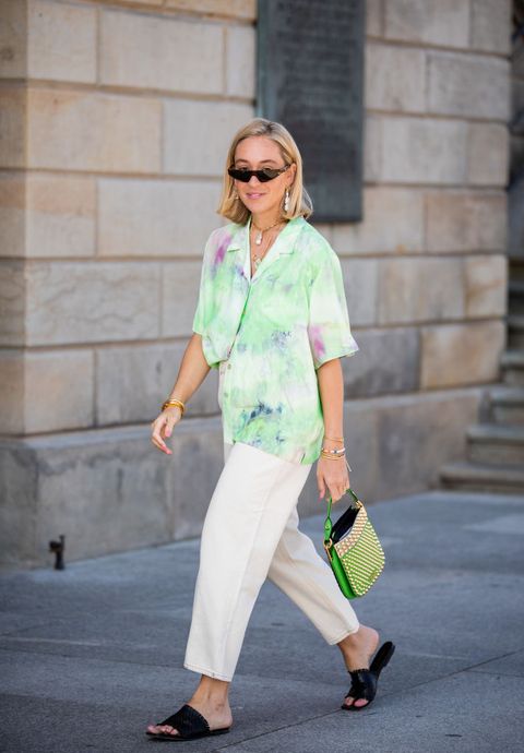 以酪梨綠襯衫搭配白色九分寬褲,利用包包、涼鞋、小物飾品增加造型感,化身隨興卻時髦的都會女子。