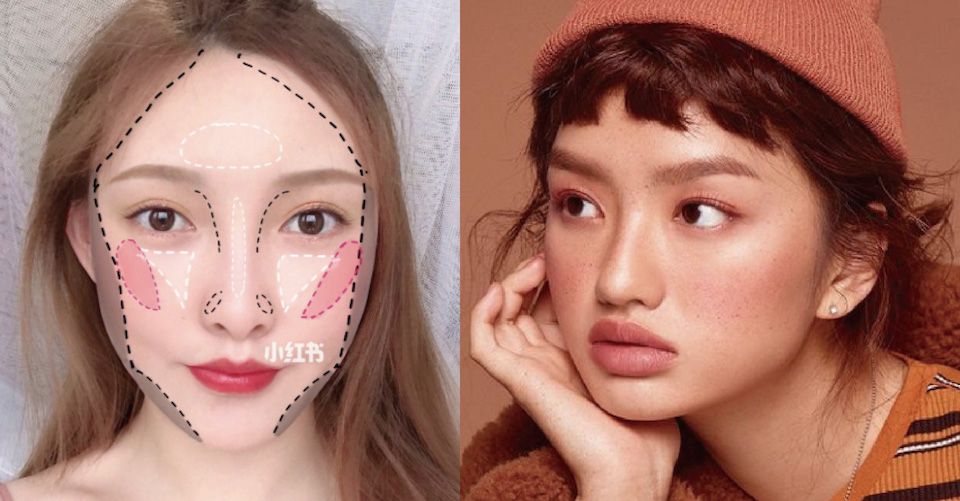 方臉型的女孩有著較明顯的臉部輪廓,為了柔和銳利感,建議在臉周圍以大面積做修容(特別是下顎處~),並將打亮掃在鼻樑、額頭處等臉蛋較中間位置,以此增加五官立體感。而腮紅斜掃在顴骨,則能視覺上自然地收攏臉型,形成瓜子小臉。