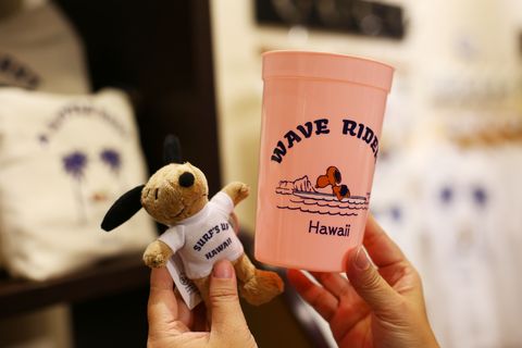 粉色、白色等色的環保水杯上印著不同的史努比在夏威夷生活的快樂畫面,隨身帶著走,既環保又開心。而比手掌還小、曬成焦糖色的迷你版史努比,更是可愛翻天!