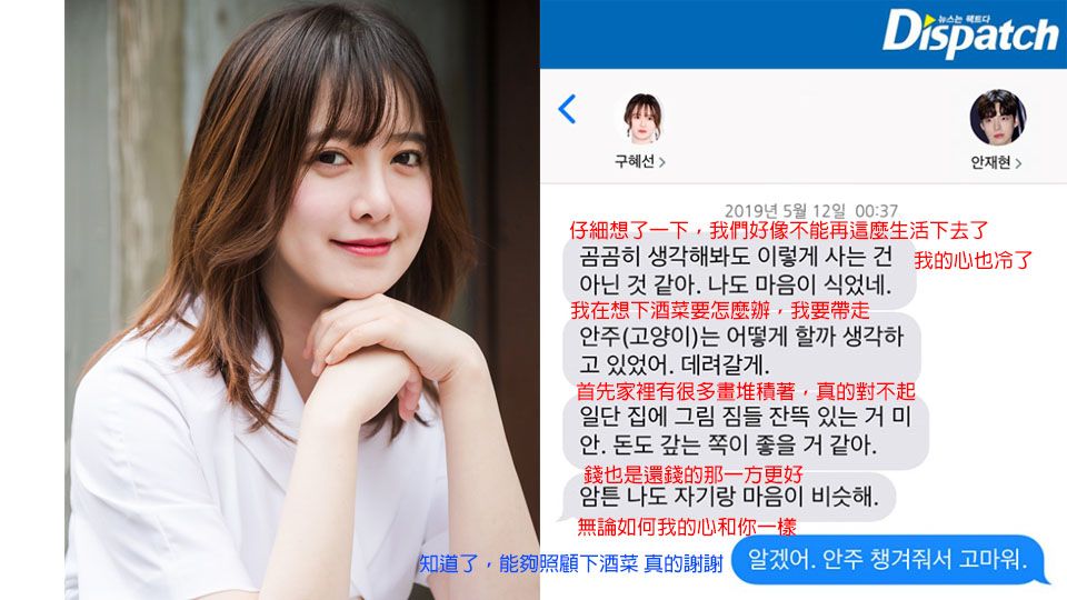 安宰賢才公布對話,具惠善就在IG回嗆。具惠善說安宰賢今年換了3次手機,覺得D社修復過短信內容。而具惠善之所以受不了、要和安宰賢分開,是因為安宰賢和合作女演員的緋聞多次傳到她耳裡,安宰賢經常說他很忙、不回短信,卻笑著跟別人傳訊息,讓她覺得被背叛。
