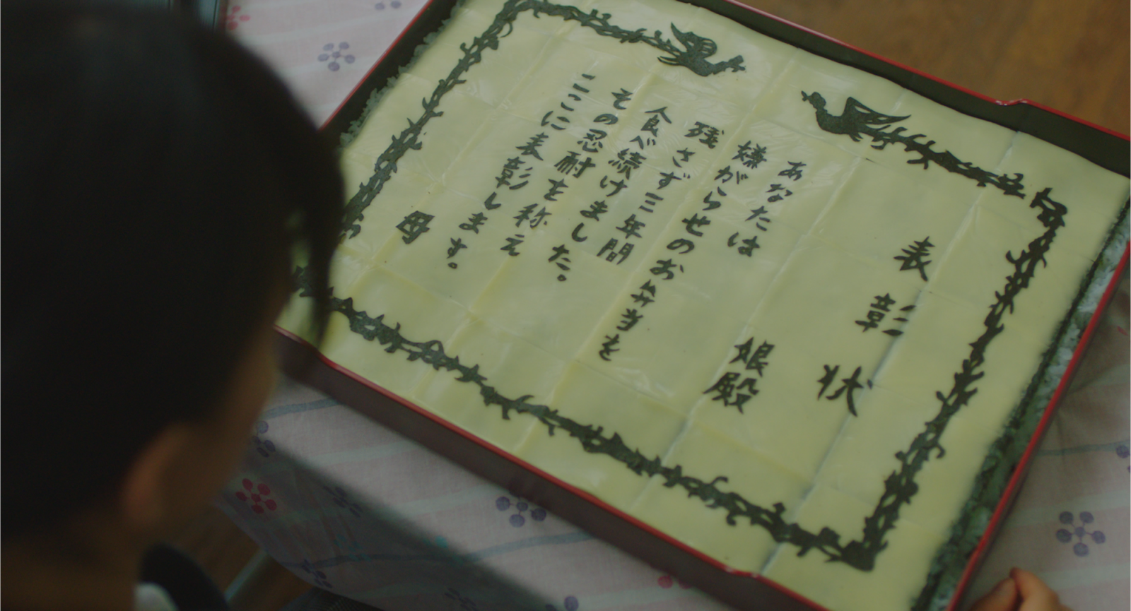在女兒畢業的那天,香織集一身的功力,製作了史上最強、最大的怨念便當,但一打開,卻讓儂編噴淚啦!上頭寫著:「獎狀,給我的女兒,這三年來,感謝妳努力地把便當吃完,在此表揚妳的毅力,媽媽!」她與女兒的感情因為便當而越變越緊密,《今天也要用便當出擊》電影版也將於9/12上映,快到電影院感受一下這溫暖又搞笑的電影吧!