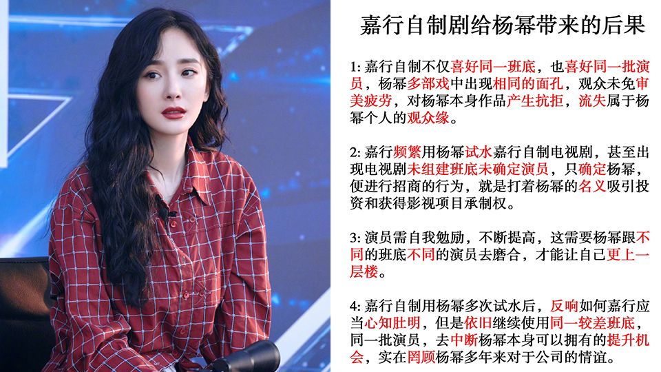 楊冪粉絲表示,嘉行頻繁用楊冪試水公司自制劇,使用同一批演員,借楊冪的光環帶藝人,製作出來的品質卻很差,讓楊冪的發展一直停留在「偶像明星」無法向上提升。