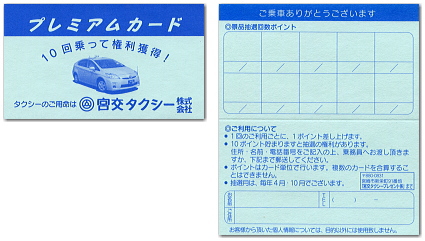 有去過日本購物的朋友都一定會有被問是否有集點(ポイントカード)的經驗。日本幾乎每一家店舖都有集點活動,所以生活在日本,通常都要另外準備一個卡包來存放大量的集點卡。而計程車也一樣,大部份的計程車公司都會有自己的集點卡,每乘坐到固定金額可以獲得一點,集滿指定點數就可以折抵下一趟的部份金額,所以如果預計自己的接下來的旅程很常會乘搭計程車,不妨可以問一下司機是否有集點活動,不過記得集點活動必須搭乘同一家公司的車才能算哦!