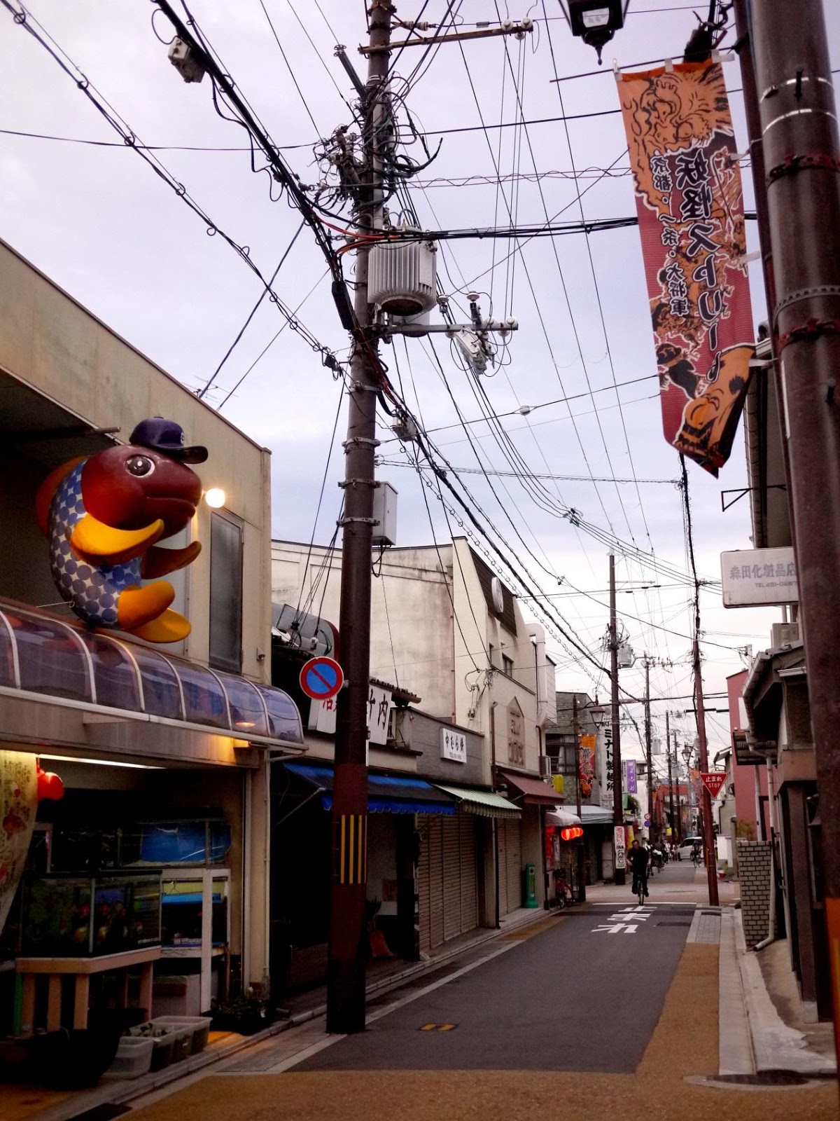 ▲平時顯得靜謐的商店街,別有一番風味,水族店的上面就有一隻巨大的魚妖怪。
