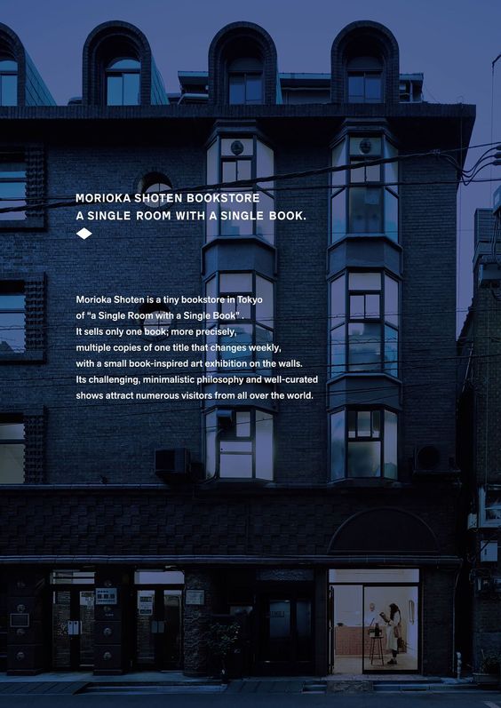 一間只賣一本書的書店,致力於將人們刻板印象中「書店=賣書」的概念打破,以一周為一個週期,正中央為主角書籍,兩側牆壁則圍繞著此週主題展覽藝術品,為的是讓訪客們更有身歷其境之感,除了展現書中的意念外,亦給予了更多的想像空間。
