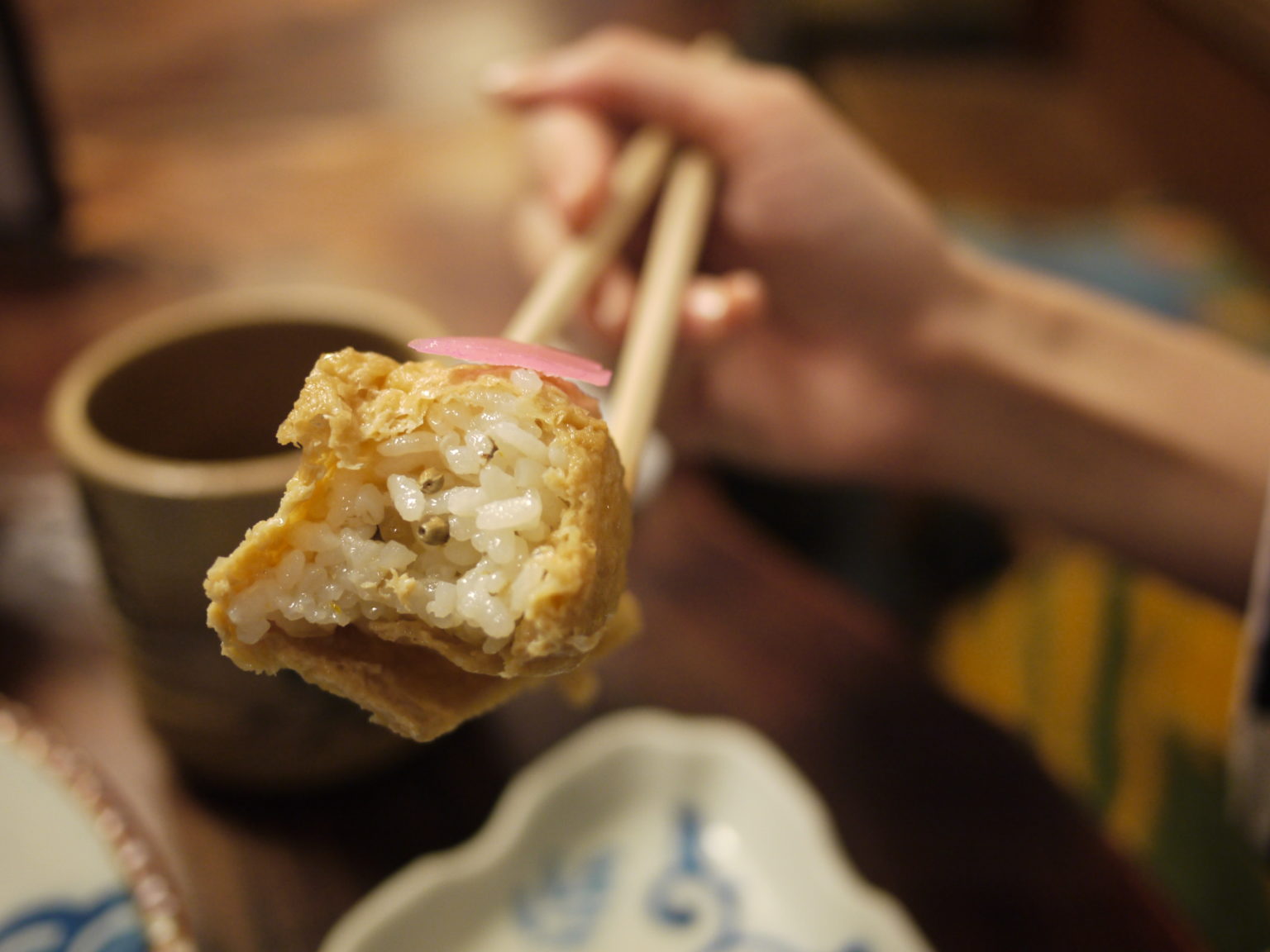 在稻荷壽司裡面加了讓人意想不到的「麻の実」與「柚子」,就是這個味道讓我忍不住稱呼這裡的稻荷壽司為「世界上最好吃的稻荷壽司」,「麻の実」其實是一種大麻屬的植物種子,在七味唐辛子裡面也會放,味道也有點像大家較為熟悉的山椒,而「柚子」不是中秋節吃的那種柚子喔!是黃黃圓圓有點像黃色葡萄柚的一種水果,在日本非常常拿來作為料理的調味以及甜點飲料。