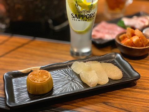 飲品則是清爽的柚子檸檬沙瓦,最後甜點更畫龍點睛配上香港年年斷貨的超人氣美心流心奶黃月餅與現剝柚子,中秋就該如此美酒搭燒肉!