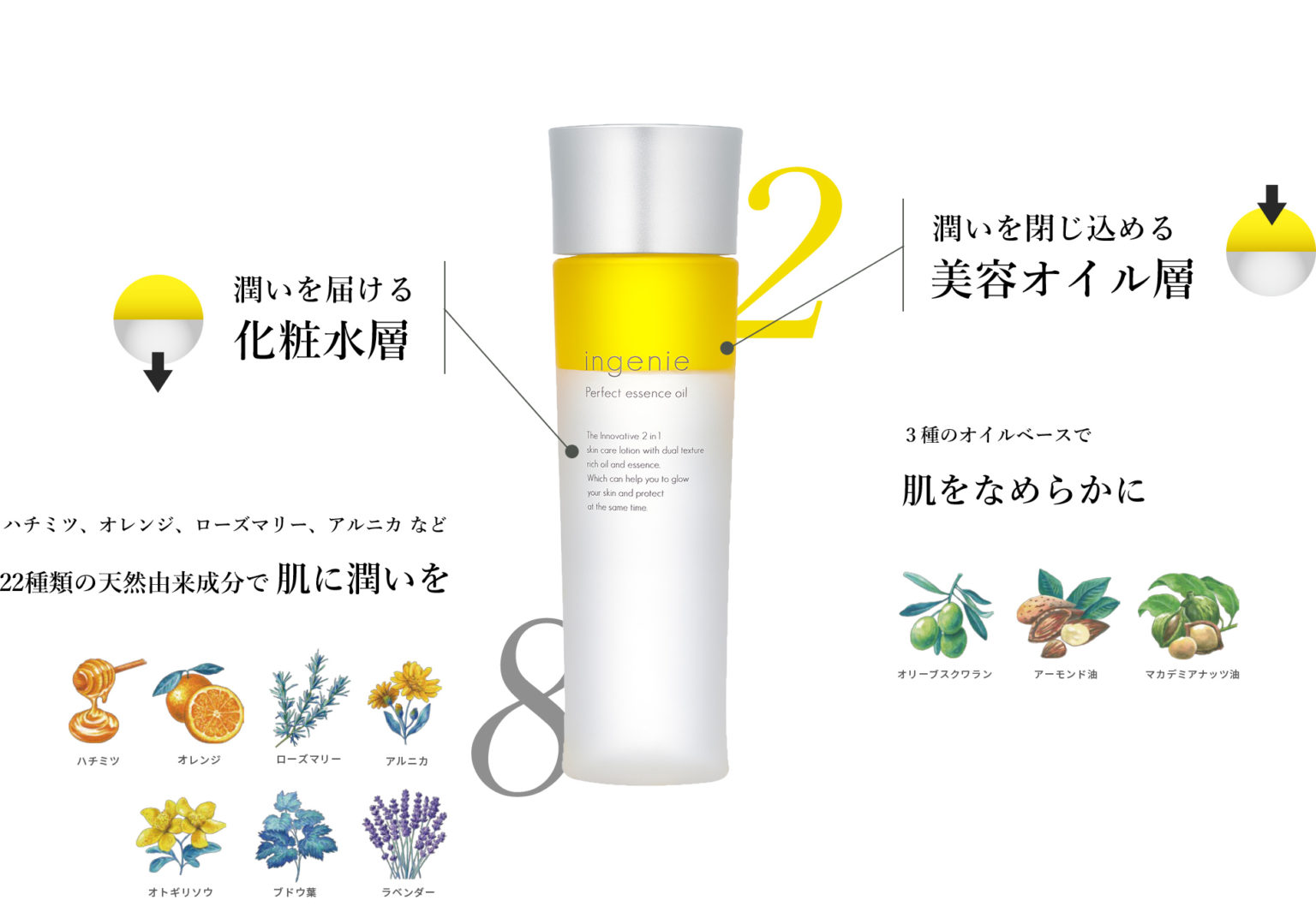 一瓶就能貫徹所有保濕的功效,10月1號才發售的インジニエ(ingenie)聽到了忙碌女孩的心聲,誕生了化妝水+美容液兩層形式的產品,達到保濕與鎖水同時進行的理想狀態。
