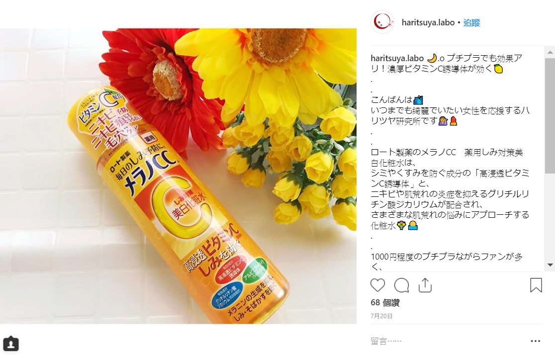 由樂敦製藥推出MelanoCC美白化妝水(メラノCC)因為平價又好用,在SNS上擁有高人氣。擁有高滲透型維他命C成分,以及其他滋潤成分,從潔面泡沫、化妝水、美容液三樣商品為一組的保養概念,從夏天開始就成為許多女孩的定番保養品。