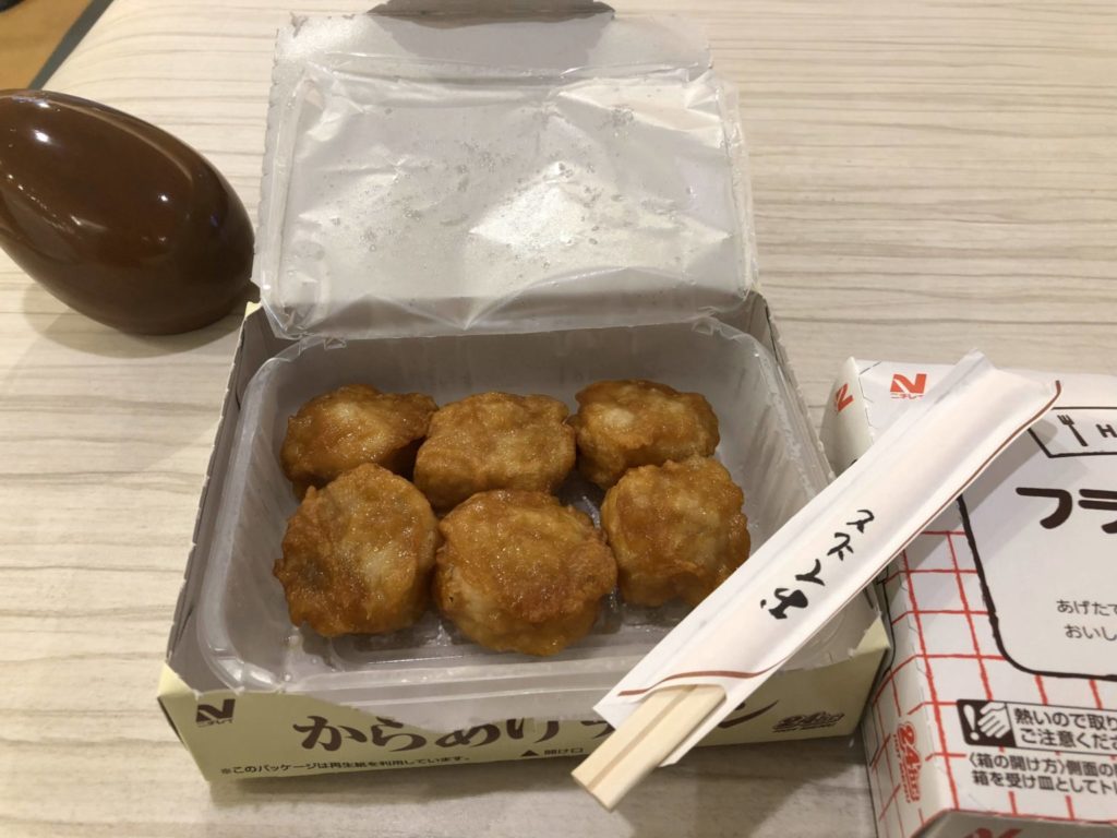 (熱食炸雞塊,附有短短的筷子以及調味包,微波後即可食用,左邊的深色物體是位於桌旁的把手,可以輕易抓穩。)