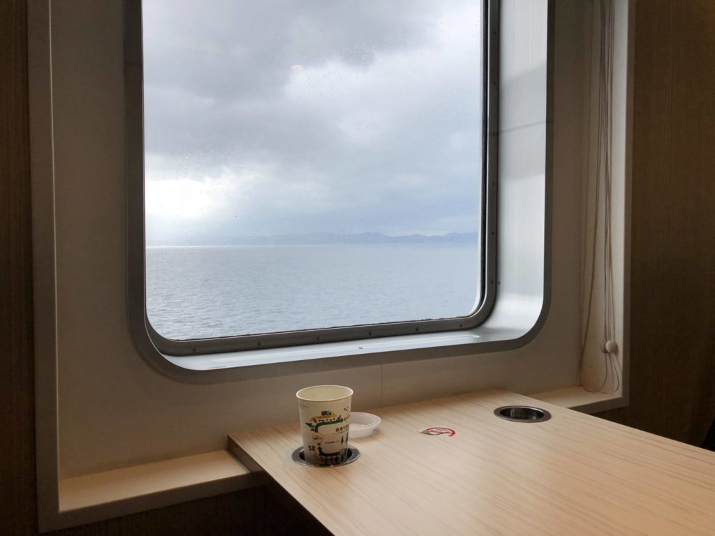 渡輪上依照價位分為私人房間以及公共房間,窗邊有座位區可以欣賞海景,也有簡單的自動販賣機販賣飲料、泡麵以及雞塊等點心,因為船身航行中會搖動,因此到處都可以看到扶手或握把,椅子也都已經固定在地面,避免因為搖晃而翻倒。