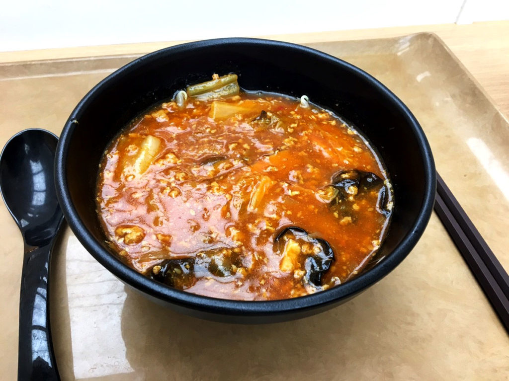 與一般拉麵有些許不同,赤門拉麵是有勾芡的羹拌麵的感覺,紅通通的湯汁看來就十分能引起食欲,一入口韓式泡菜的味道直衝鼻腔,鋪墊大量的豆芽菜與爽脆的木耳增加口感的豐富度。不擅長吃辣的朋友們可能要三思一下,筆者可是邊吃邊灌冰水阿(笑),但冷冷的天氣吃些辣的食物有助身體暖和真是不變的定律呢!
