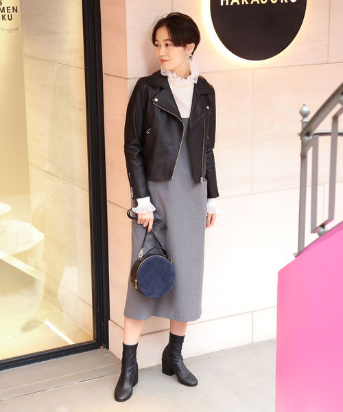 同樣深受日本女生喜愛的Ray BEAMS,擅長將多層次與異材質混搭,以黑色霧面的騎士皮衣外套,運用短版剪裁讓身形修飾高挑顯瘦的好比例,內搭荷葉領洋裝,帶點個性又時髦的風格,完整表達日系形象的街頭氣息。