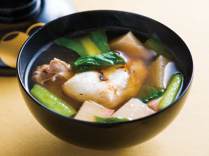 使用雞骨與昆布熬煮的高湯,材料使用小松菜、蘿蔔、魚板等,調味由高湯和醬油為主,是簡單又美味的一品。
