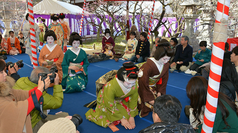 另一項受注目的活動,就是梅花祭的「野宴茶道」了。野宴茶道源自十六世紀,豐臣秀吉於1587年統一日本後,在北野天滿宮舉行的一項茶道儀式。現今的野宴茶道儀式舉辦至今,已有超過半個世紀的歷史。