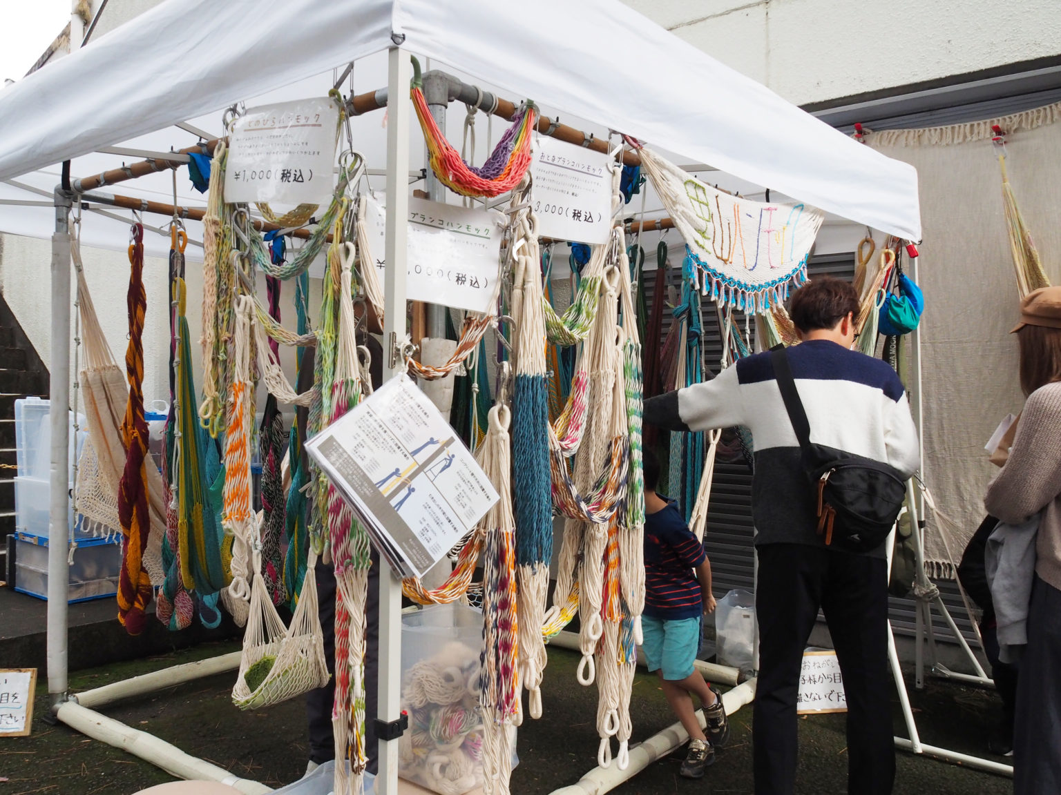 環保吊床吸引了許多小朋友駐足體驗,手工編織染色的商品也相當受歡迎。