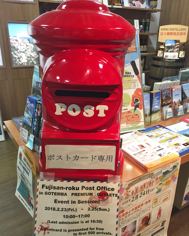 從2月23日到2月25日,御殿場Premium Outlet 會於服務中心設立一個富士山郵局,在這裡寄出的信片或名信片都會印上特別的富士山郵局章,而且還是免郵費。另外前500名來這裡的客人還可以獲得一張免費的富士山景色POSTCARD哦!