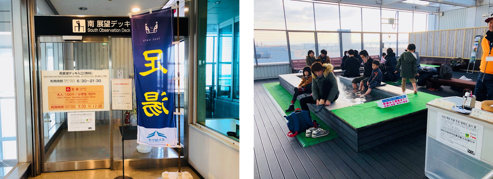 建議返台的旅客可以先到櫃檯辦理報到手續後,再到三樓免費泡足湯順便看飛機!另外推薦購買足湯限定毛巾,只要日幣100円,毛巾上面有機場的標章及足湯紀念字樣!非常值得收藏又可以順便擦腳