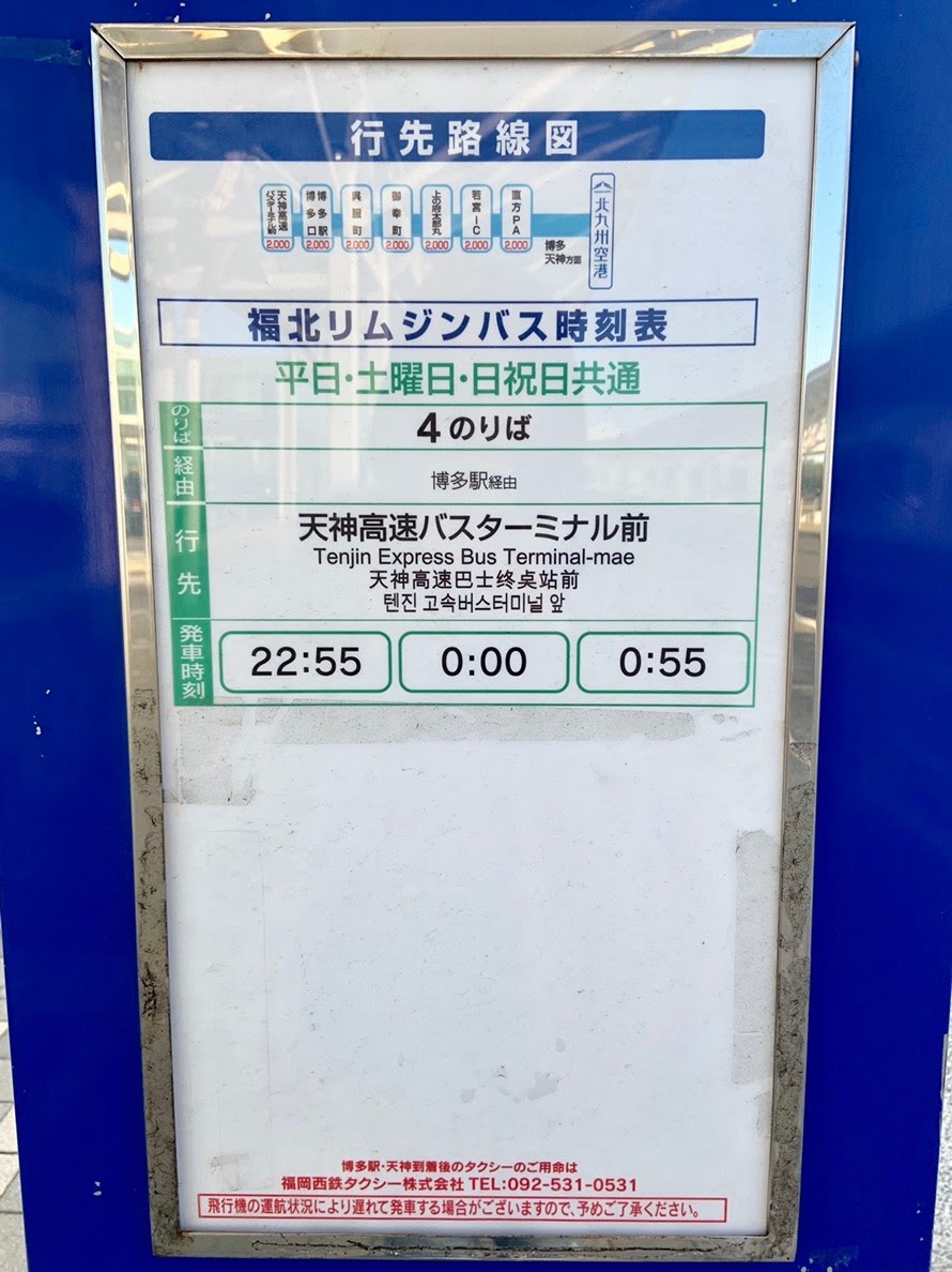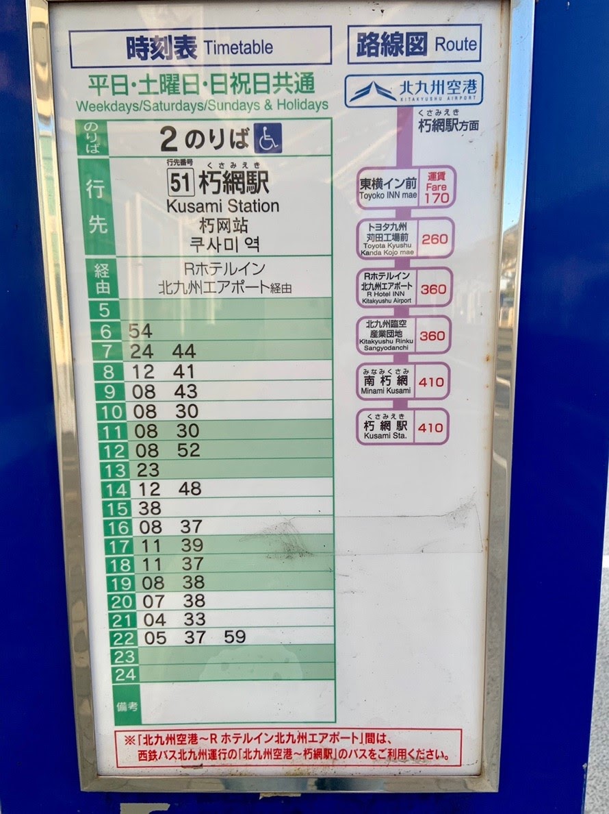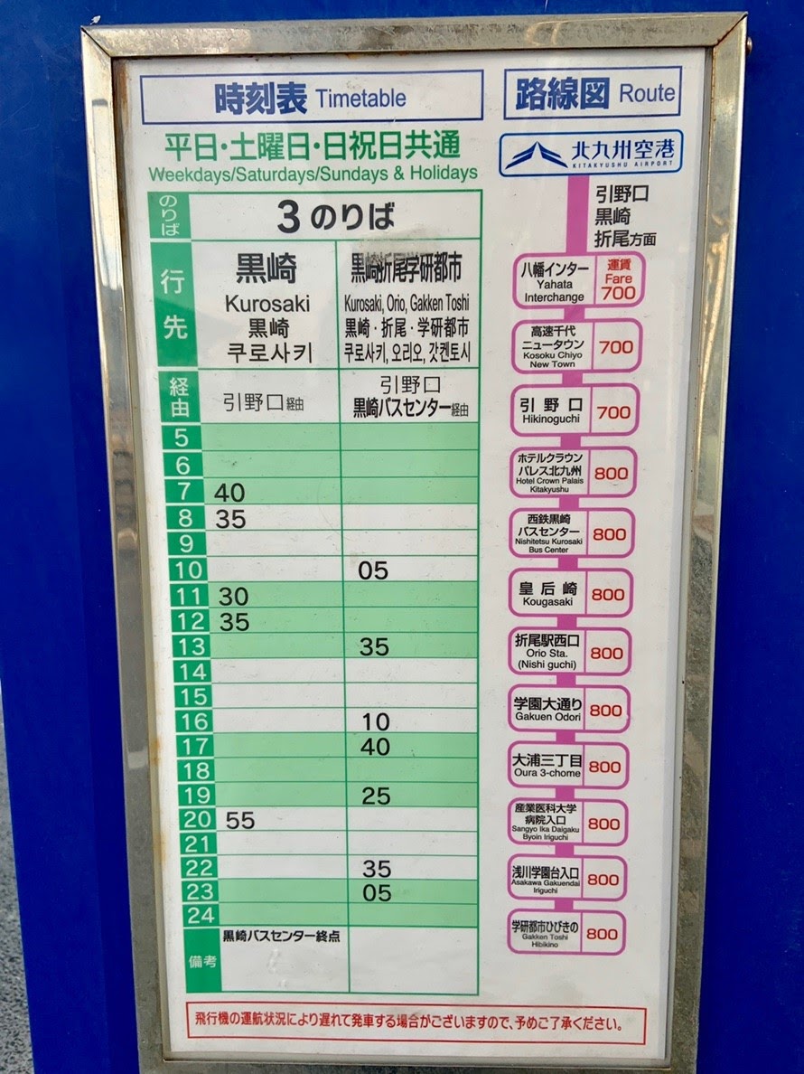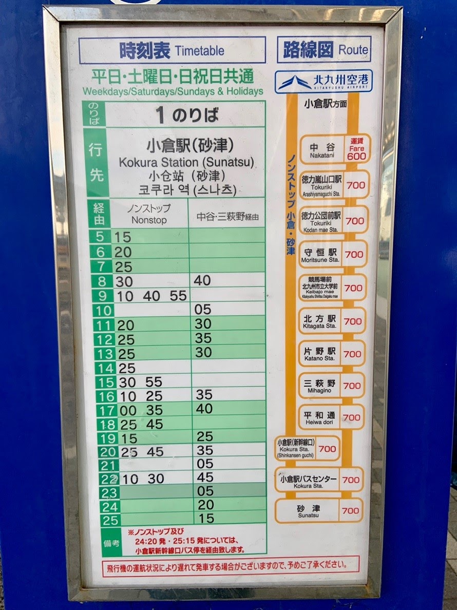 北九州機場沒有直接相連的鐵路車站,最接近的是日豐本縣朽網站、苅田站,所以必須得靠巴士離開這個機場人工島。機場也設置了五個目的地的巴士站,以下將五個站牌時刻表分享給大家: