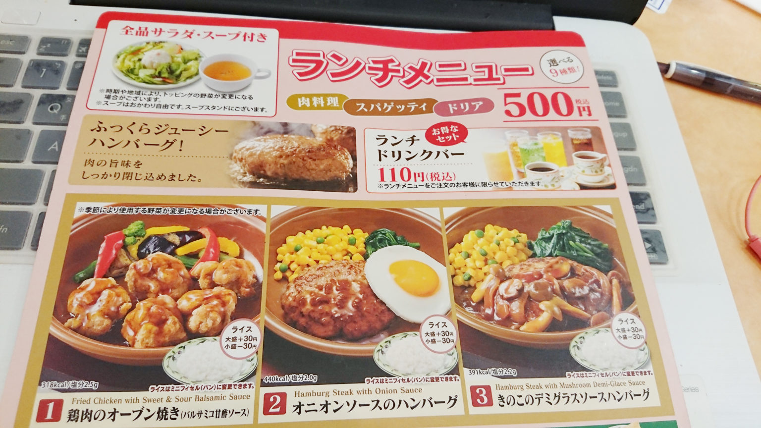 ▲平日的中午還有午餐優惠時段!主餐附沙拉與湯只要銅板價500日幣。日本知名的連鎖家庭餐廳還有Gusto(ガスト)、Jonathan’s(ジョナサン)、Bamiyan中式家庭餐廳(バーミヤン)等等。