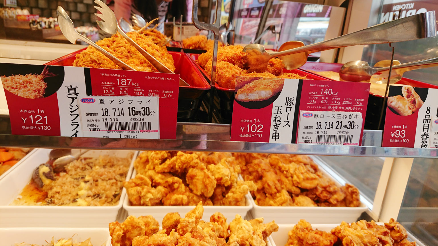 在日本也有便當店跟自助餐,只是菜色跟台灣不一樣。普遍的便當店內用餐環境乾淨明亮。大部分女性如果不想吃便當,可以選擇自助餐依自己的喜好挑選想吃的食物(每100g/185日幣)。標價卡上提供的詳細的內容,讓在飲食控管的人也能清楚知道攝取食物的營養成分和卡路里,簡直是對外食族非常友善!
