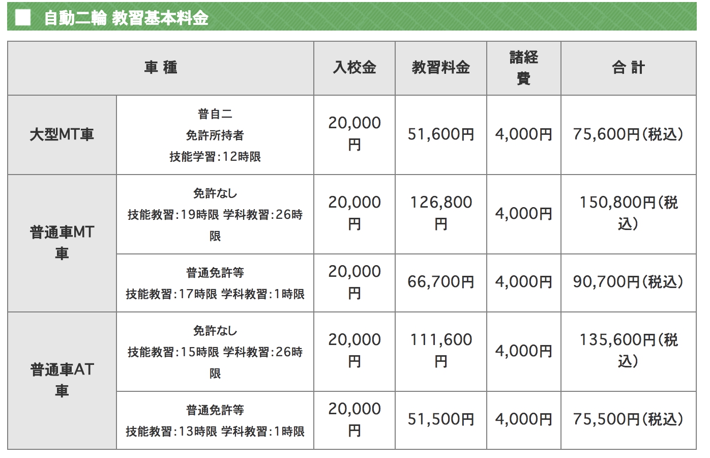 而普通汽車駕照所需講習時數則是技能講習34小時,學科講習26小時,金額為268,600日元,約72,800台幣。對於日本人來說,開車可以說是每個人的必備技能,而且日本的K-Car(660cc以下小四輪)這相對便宜,所以除非本身對摩托車很有愛,不然一般都會選擇直接考取汽車駕照。而持有普通汽車駕照即可駕駛原付亦是其中的原因。