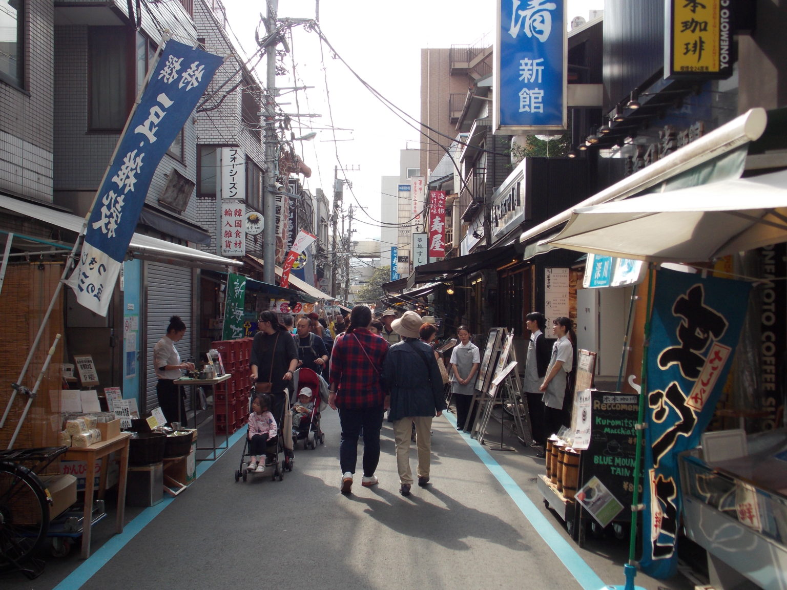 離開市場後,如果想親自做個比較的話,可以散步或搭乘百合海鷗線電車至新豐洲站,轉乘公車直達築地場外市場。親自來一趟之後會發現,雖然場內工作區已經完全關閉並且禁止進入,築地場外市場仍然相當熱鬧,比豐洲市場的相關店舖區好逛很多,幾乎是維持原貌。
